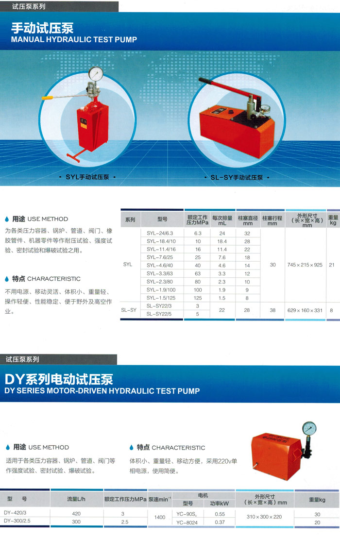 為各類壓力容器、鍋爐、管道、閥門、橡膠管件、機器零件等作耐壓試驗、強度試驗、密封試驗和爆破試驗之用。