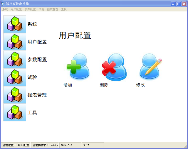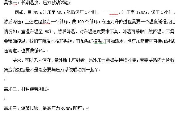 本控制系統的計算機壓力采集控制軟件的主要功能參照客戶產品的標準設計:軟件界面及控制內容由用戶提出要求,我們完成功能。并提供日后升級服務。(本設備先應用本公司計算機控制壓力測試系統通用軟件待用戶能提出最終的軟件修改要求為止,期限為設備使用起三個月,如以后我公司計算機控制壓力測試軟件升級換代,在不增加硬件成本的前提下可免費為需方升級。)