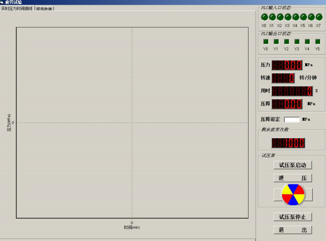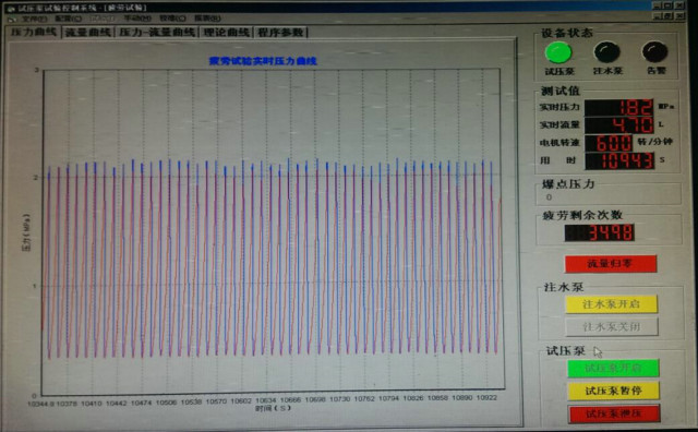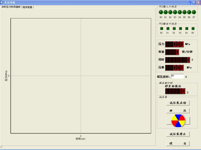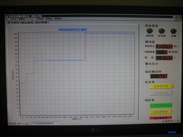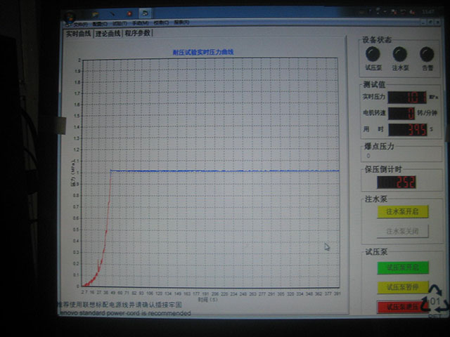 4、系統壓力無級調節,靠計算機軟件控制;試壓泵本身的一些硬件功能包括:“開始”、“暫停”、“卸壓”、“手動調壓”等;