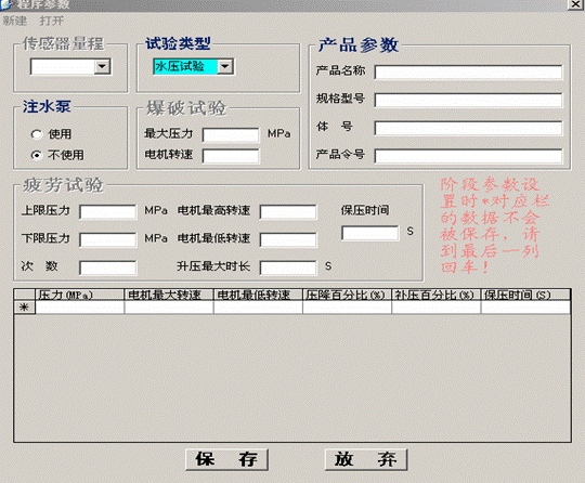 選擇試驗(yàn)類型,產(chǎn)品參數(shù)等。根據(jù)不同試驗(yàn)類型,會(huì)有不同參數(shù)需要配置。水壓試驗(yàn)必須填壓力階段參數(shù),爆破試驗(yàn)如果需要階段打壓再爆破也要填階段壓力參數(shù)。壓降百分比是指保壓時(shí)間內(nèi)下降的壓力超過設(shè)定百分比被認(rèn)為不合格。補(bǔ)壓百分比是指保壓時(shí)間內(nèi)壓力下降超過設(shè)定百分比,系統(tǒng)自動(dòng)啟動(dòng)試壓泵補(bǔ)壓。
