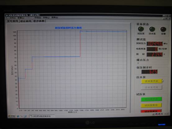 Ø 試驗(yàn)過程中升壓速率按以下規(guī)定:當(dāng)產(chǎn)品的容積為100L時(shí),從1MPa到5MPa的升壓 過程一般為30S左右;當(dāng)產(chǎn)品的容積為1500L時(shí),從1MPA到5MPa的升壓過程一般為3分鐘以內(nèi)。試驗(yàn)壓力在試驗(yàn)過程中可以任意設(shè)定單段或者多段保壓測(cè)試,也可以保壓或測(cè)泄漏后直接爆破,升壓速度能保持恒定,可實(shí)現(xiàn)無級(jí)調(diào)節(jié),升壓速度可顯示、可控制;試驗(yàn)數(shù)據(jù)和曲線參數(shù)能實(shí)時(shí)顯示、能自動(dòng)保存存貯試驗(yàn)結(jié)果、并可任意打印試驗(yàn)報(bào)表;能直接編制、保存、調(diào)用編程好的程序,防止試驗(yàn)參數(shù)輸入的錯(cuò)誤;試驗(yàn)數(shù)據(jù)能直接以模板形式生成,基本信息完整,只需要做一些備注、判斷即可,同時(shí)試驗(yàn)結(jié)果可編輯,可聯(lián)網(wǎng),可與OFFICE辦公軟件兼容,其模板可重新編制,并設(shè)定。