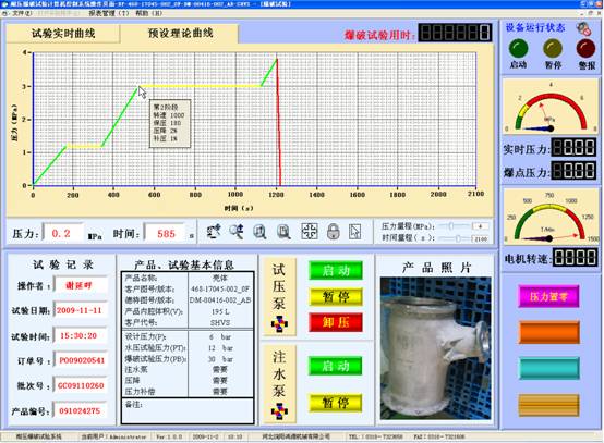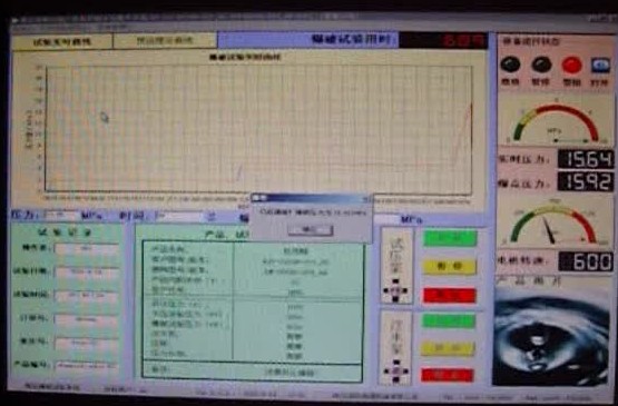 本系統內置本公司自主研發的專用控制軟件,操作界面人性化,軟件性能成熟穩定無缺陷,可以任意設定試驗項目、壓力值、保壓時間等各種試驗參數。完善的人機交互界面,制定試壓方案后會通過彈出窗口的形式引導操作員完成實驗。通過對話框上“確定”,“取消”按鈕對相對危險(例如爆破實驗)的試驗項目,讓程序員進行確認,確定實驗的準確與安全。軟件可根據用戶技術要求更改功能,可按照用戶自定義界面及功能編制,以雙方最終溝通需方認可的界面為準。