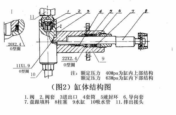 1、 拆下集水管(參看結構圖),取掉缸體與十字頭體連接的六個M8螺母,拉出缸體,可不取下柱塞(取下柱塞的目的是壓入填料時先裝入柱塞,使填料順著柱塞與填料之間壓入,起導向作用。如有同直徑的零件代用,也可以不拆柱塞)。