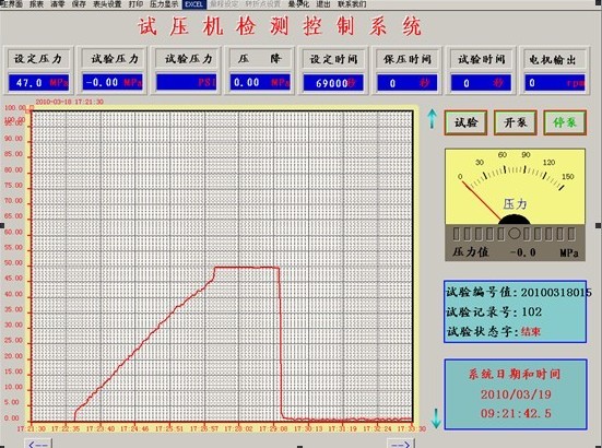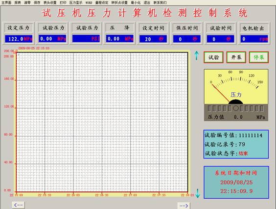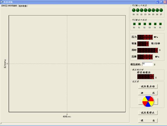 c) 壓力無級調節,靠計算機軟件控制;試壓泵本身的一些硬件功能包括:“開始”、“暫停”、“卸壓”、“手動調壓”等;