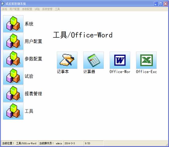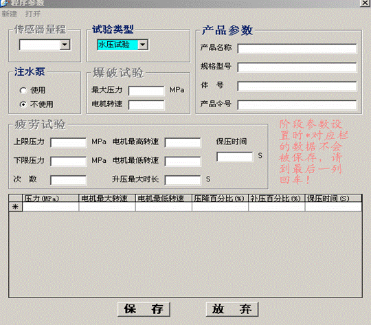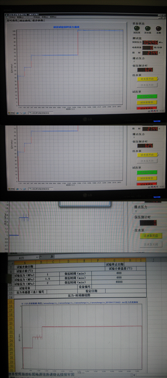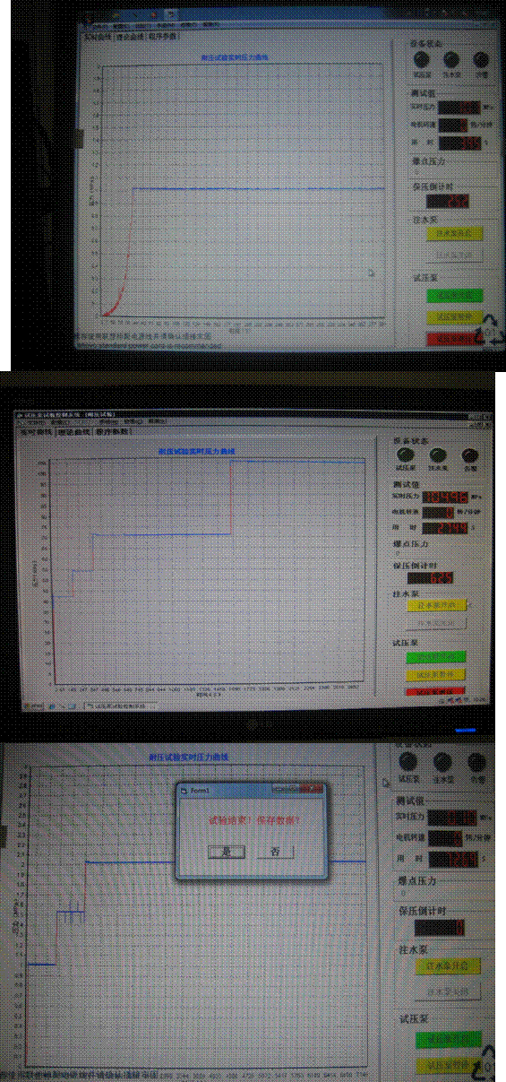 本系統內置本公司自主研發的專用控制軟件,操作界面人性化,軟件性能成熟穩定無缺陷,可以任意設定試驗項目、壓力值、保壓時間等各種試驗參數。完善的人機交互界面,制定試壓方案后會通過彈出窗口的形式引導操作員完成實驗。通過對話框上“確定”,“取消”按鈕對相對危險(例如爆破實驗)的試驗項目,讓程序員進行確認,確定實驗的準確與安全。軟件可根據用戶技術要求更改功能,可按照用戶自定義界面及功能編制,以雙方最終溝通需方認可的界面為準。