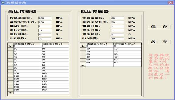 量程為傳感器量程,最大安全壓力應不超過傳感器量程,爆破門限是指在100毫秒內壓力下降爆破門限所設定值以上認為是爆破。泄壓門限是指泄壓到設定門限以下認為泄壓結束。泄壓延時是指泄壓到泄壓門限后繼續泄壓設定時間后停止泄壓。PID系數設定范圍為10-50。數值越小,打壓速度會越慢,反之速度會快,對于小容器,應選小的系數,大容器應選大的系數。傳感器校準填入測量值和實際值。至少要包含0和量程兩個值,*對應欄的數據不會被保存。