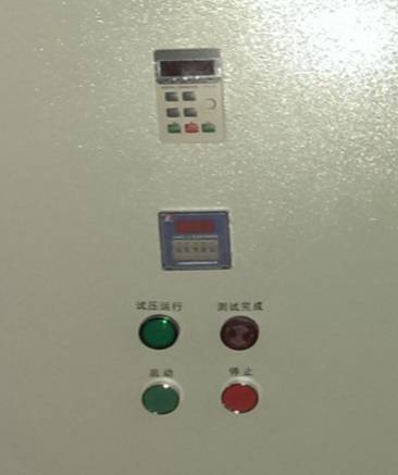 該試壓泵,電動試壓泵,變頻控制試壓泵控制系統(tǒng)具有以下功能:壓力遙控自控、自動升壓保壓、手動梯度升壓、變頻變流量。該泵在使用前,只需在電接點壓力表上設定好上限壓力值,在數顯時間繼電器上設置好需要保壓的時間,然后用遙控器或按試壓泵啟動按鈕。當被測氧氣瓶大小不等時,操作人員可在試壓過程中通過扭動變頻器旋鈕任意改變試壓泵電機的轉速,從而達到調節(jié)試壓泵升壓流量和升壓時間的目的。當壓力達到試壓事先設定的目標值時,試壓泵會自動停止進入保壓狀態(tài),當保壓時間到設備會通過蜂鳴器報警然后通過手動泄壓閥泄壓。