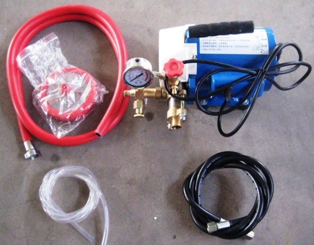 (1)擰松紅色壓力調節(jié)旋鈕,插上電源線開啟電機,查看機子是否有吸力,然后關機,將各管子按上圖所示連接。