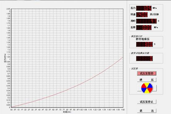 4、系統壓力無級調節,靠計算機軟件控制;試壓泵本身的一些硬件功能包括:“開始”、“暫停”、“卸壓”、“手動調壓”等;