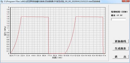 附件:計算機控制軟件一些基本功能,圖片僅供參考具體請以實物為準。下面是根據客戶技術要求,現場使用本公司試壓控制軟件做出來的真實試驗曲線,試壓軟件界面及其功能僅供參考:(此界面也可根據客戶提出要求,定做界面)