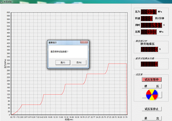 保壓時間到,泄壓閥自動開啟泄壓,泄壓完畢,彈出對話框是否保存試驗數據