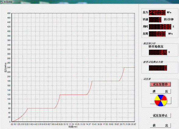 9、試驗程序及參數預輸入功能,按照被測試容器設定典型的試驗程序有:恒速升壓—保壓—泄壓;恒速升壓—直至爆破。恒速升壓—保壓—恒速升壓—保壓—恒速升壓直至達到試驗標準壓力;多段恒速升壓保壓試驗過程(可程序選擇階段0-10段)--恒速升壓直至達到試驗標準壓力;另外本軟件可以任意設定疲勞測試功能,1-10萬次。
