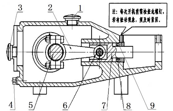 1、注油孔(氣螺塞) 2、連桿 3、油窗 4、放油螺塞 5、曲軸 6、連桿銷套 7、十字頭 8、O形圈55×1.9 9、Y形油封25×20×8 圖2 動力端結構 |