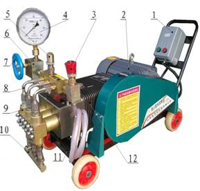 三、結構特點 本試壓泵主要采用臥式三柱塞泵型式,由電機、電磁起動器、動力端、液力端、安全溢流閥、調壓溢流閥、保壓閥、卸壓閥、泵架、吸入排出膠管等組成(圖1)。 1、電磁起動器 2、電機 3、調壓溢流閥 4、壓力表 5、安全溢流閥 6、保壓閥 7、卸壓閥 8、集水管 9、液力總程 10、吸水管 11、機架 12、動力總程 圖1泵結構圖 動力總程(圖2)由電機通過皮帶減速,帶動曲軸連桿機構,將旋轉運動轉換為往復運動。并通過十字頭帶動柱塞在液缸內往復運動。 | ||||||||