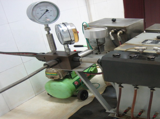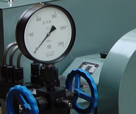 4、本系統(tǒng)分別采用1.6級150圓200MPa耐震壓力表、1.6級150圓160MPa耐震壓力表、1.6級150圓100MPa耐震壓力表三塊壓力表分別用來做高中低壓試驗,將同一塊壓力表下的高中低壓誤差降到最低。