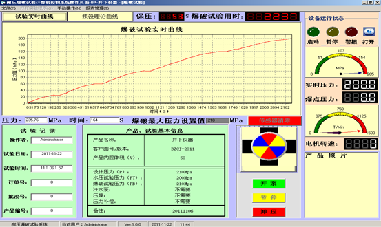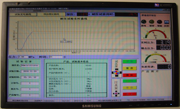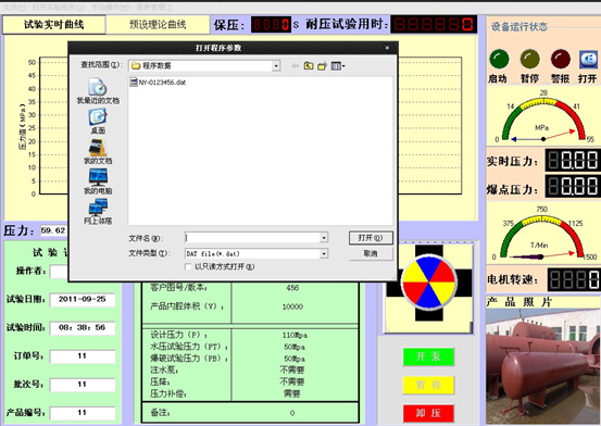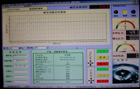 本系統(tǒng)內(nèi)置本公司自主研發(fā)的專用控制軟件,操作界面人性化,軟件性能成熟穩(wěn)定無缺陷,可以任意設定試驗項目、壓力值、保壓時間等各種試驗參數(shù)。完善的人機交互界面,制定試壓方案后會通過彈出窗口的形式引導操作員完成實驗。通過對話框上“確定”,“取消”按鈕對相對危險(例如爆破實驗)的試驗項目,讓程序員進行確認,確定實驗的準確與安全。軟件可根據(jù)用戶技術(shù)要求更改功能,可按照用戶自定義界面及功能編制,以雙方最終溝通需方認可的界面為準。