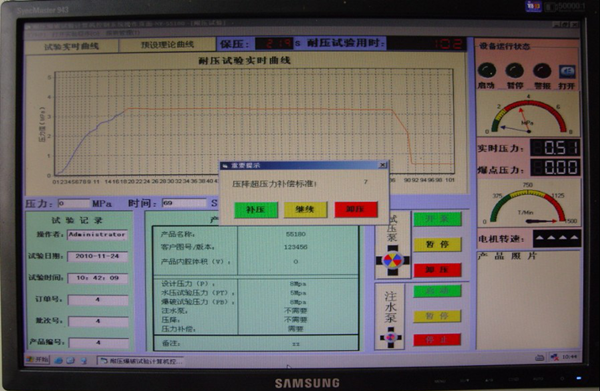 本系統內置本公司自主研發的專用控制軟件,操作界面人性化,軟件性能成熟穩定無缺陷,可以任意設定試驗項目、壓力值、保壓時間等各種試驗參數。完善的人機交互界面,制定試壓方案后會通過彈出窗口的形式引導操作員完成實驗。通過對話框上“確定”,“取消”按鈕對相對危險(例如爆破實驗)的試驗項目,讓程序員進行確認,確定實驗的準確與安全。軟件可根據用戶技術要求更改功能,可按照用戶自定義界面及功能編制,以雙方最終溝通需方認可的界面為準。